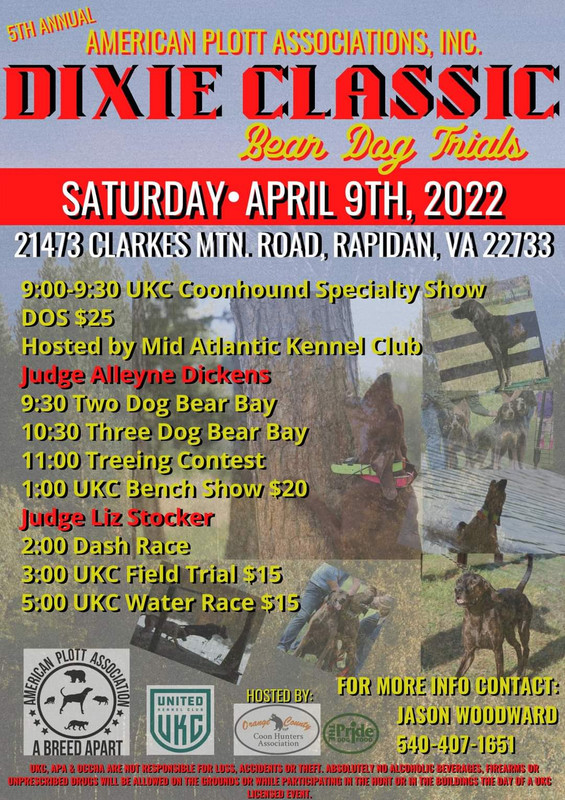 UKC Forums : Powered by vBulletin version 2.3.0 UKC Forums > Departments > UKC Coonhounds > 2022 American Plott Association Dixie Classic with results