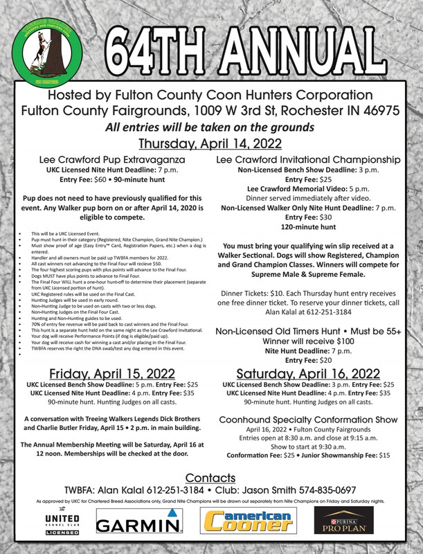 IT’S GETTING TO BE THAT TIME OF YEAR AGAIN!! MARK YOUR CALENDARS!!! HOSTED BY FULTON COUNTY COON HUNTERS, GREAT CLUB AND GREAT HUNTING UP IN ROCHESTER,INDIANA!!!!!