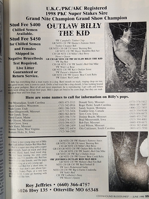 The mid to late 90s is when his popularity really started to boom, according to the number of litters produced in that timeframe. That is when the bulk of his top hounds were born. Including a 9-pup litter born in March of 1996 out of NITECH CH ‘PR’ Big G Farms Cinderella, that had 4 dogs title out. Those 4 were WCH GRFCH GRCH ‘PR’ Outlaw U2, NITECH ‘PR’ Jeffries Outlaw Red Man Red, CH ‘PR’ Gradeless’ Bitter Sweet Brutus, and NITECH ‘PR’ Bundick Bottom Sioux Baby. Then in June of 1996 a litter from ‘PR’ Lamine River Outlaw Wendy hit the ground with 3 of 7 earning titles, including NITECH ‘PR’ Outlaw Mandy Two, NITECH ‘PR’ Outlaw Belle Star, and CH NITECH ‘PR’ Mosquito Creek Outlaw Kate. 3 GRNITECHs were produced during this stretch as well, GRNITECH CH ‘PR’ Posted Land Red Elvis out of GRNITECH CH ‘PR’ Posted Land Taz born in January of 1996, CH GRNITECH ‘PR’ Posted Land Red Elmo also out of Taz but born from a later litter in November of 1997, and finally GRNITECH ‘PR’ Mosquito Creek Outlaw Sue born in April of 1998 out of ‘PR’ County Line Red Sally.