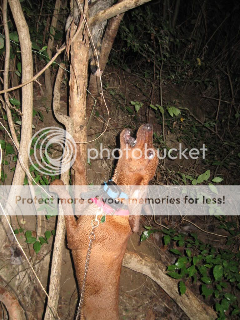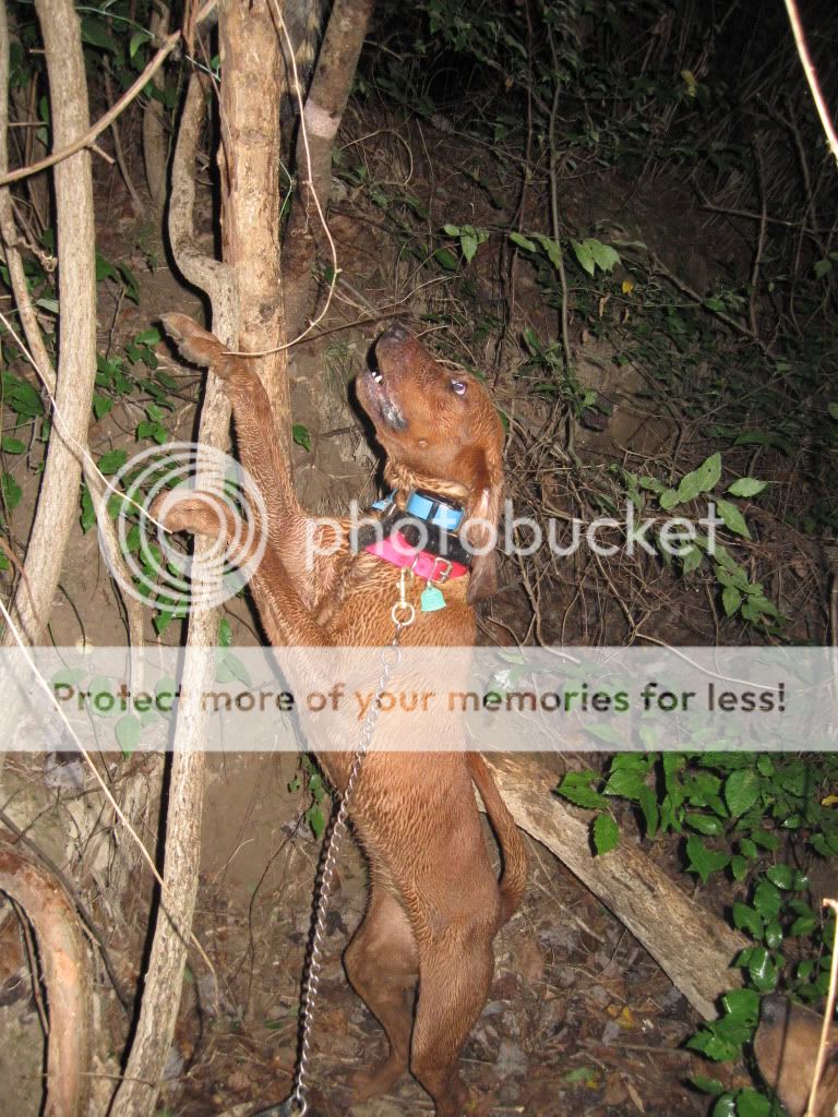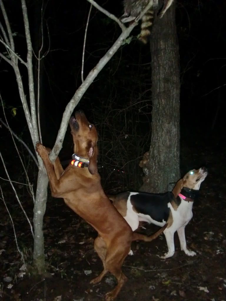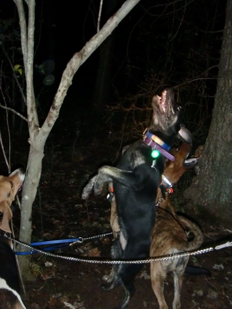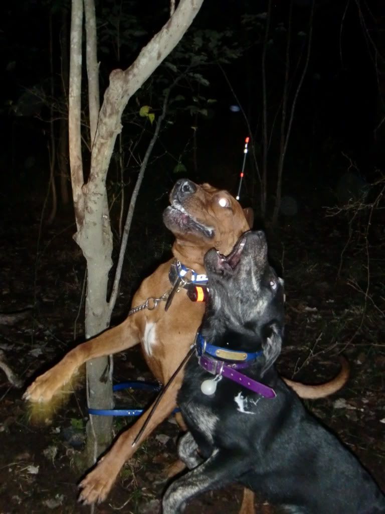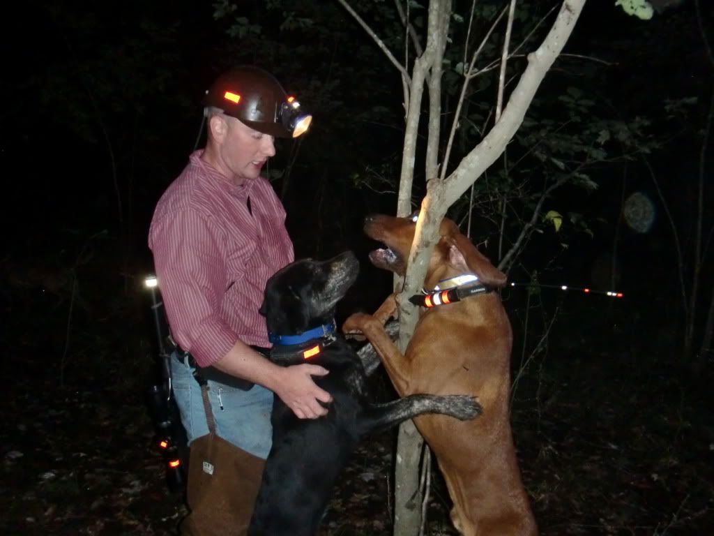 Took the Molly dog out with Duke and Jack. She did a good job of getting out and doing some investigating at first. I had to go collect up my dogs as they had taken to the hills....once I set them back out Jack struck a track and Duke chimed in. When they treed Jack treed for real, he rolled over and started to chop for me. When we got there he was stuck to the tree like the old man. I was super proud of him.