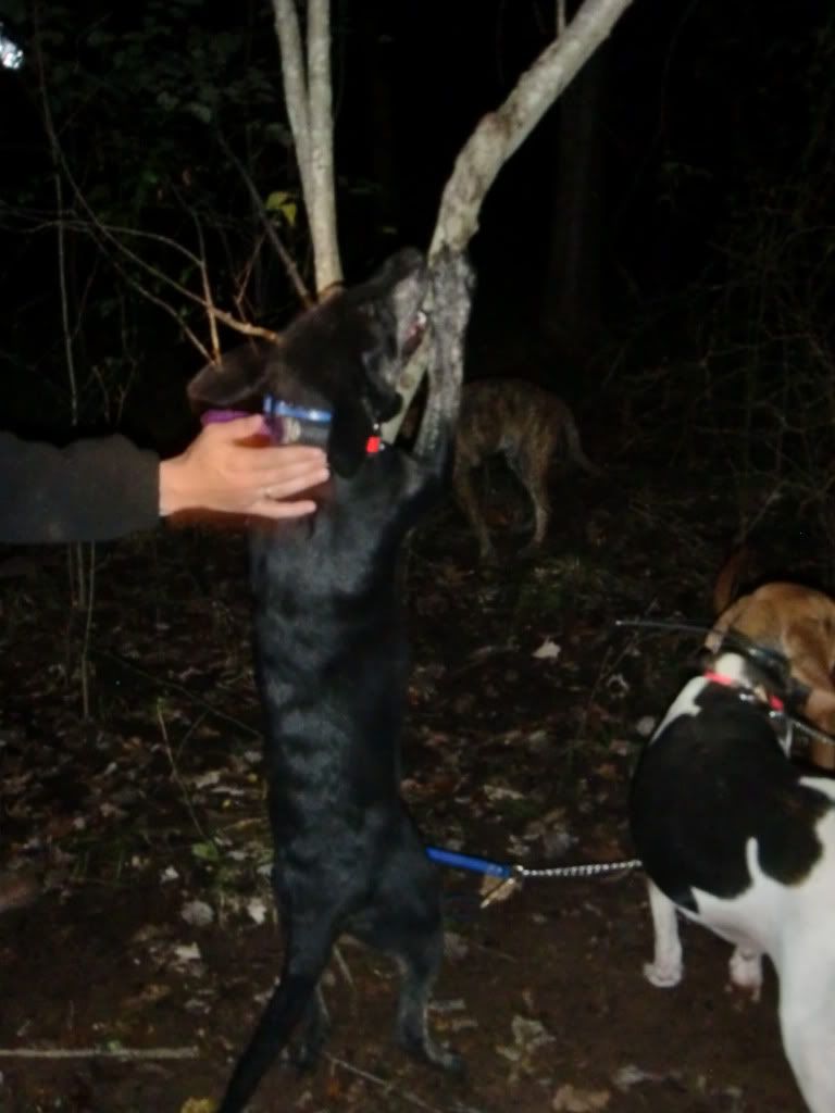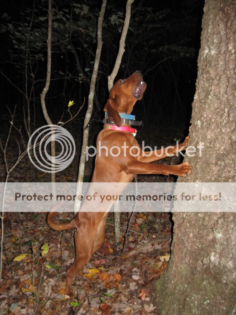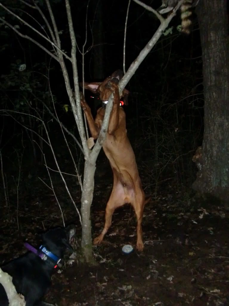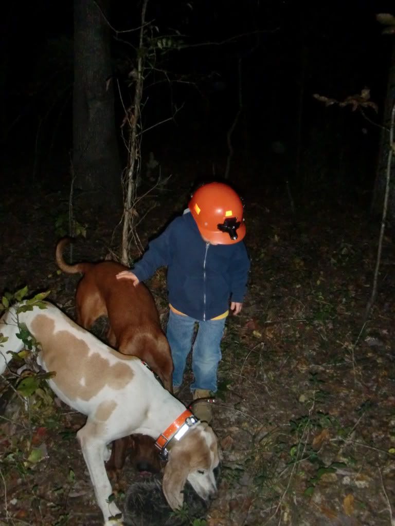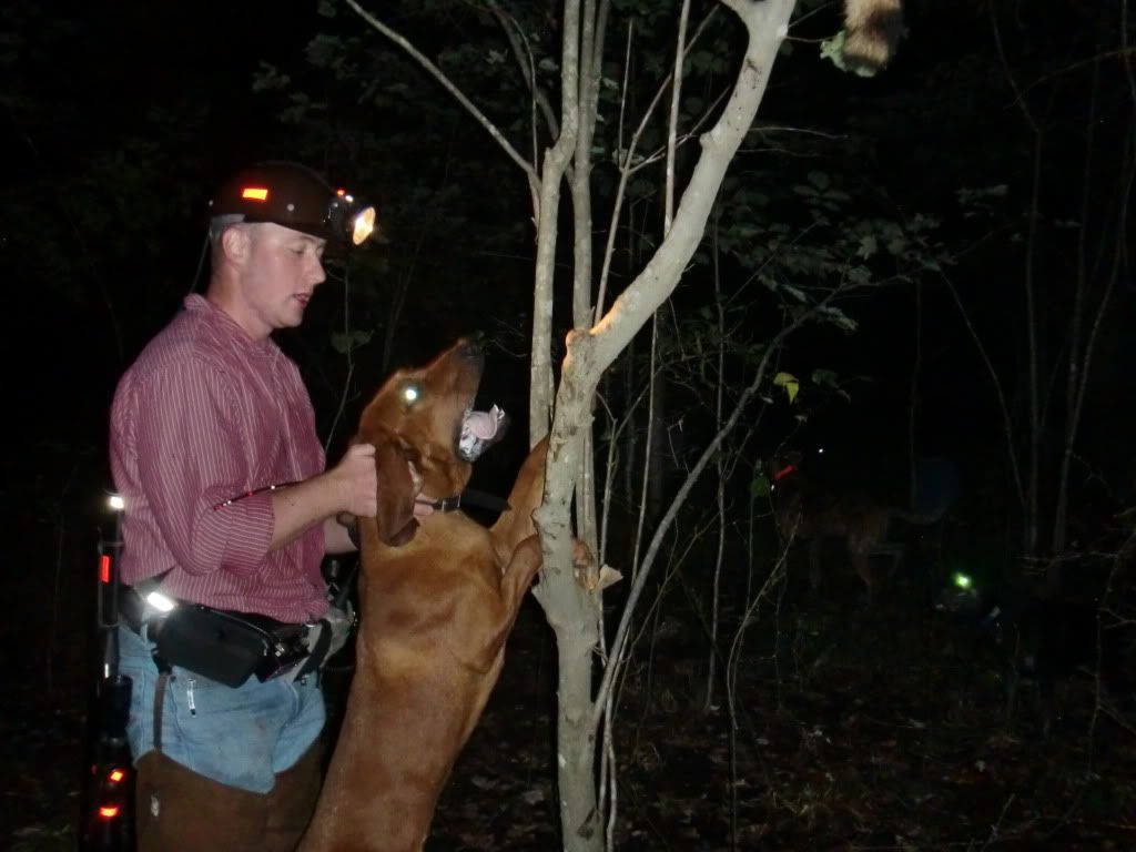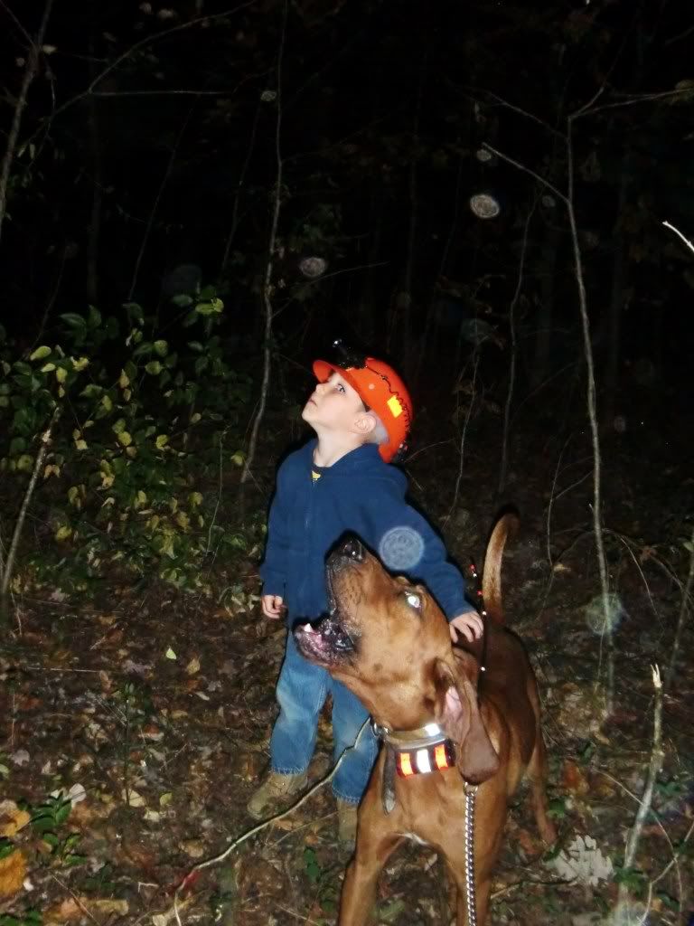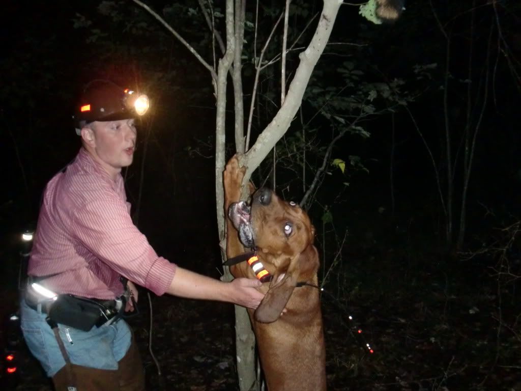 Took the Molly dog out with Duke and Jack. She did a good job of getting out and doing some investigating at first. I had to go collect up my dogs as they had taken to the hills....once I set them back out Jack struck a track and Duke chimed in. When they treed Jack treed for real, he rolled over and started to chop for me. When we got there he was stuck to the tree like the old man. I was super proud of him.