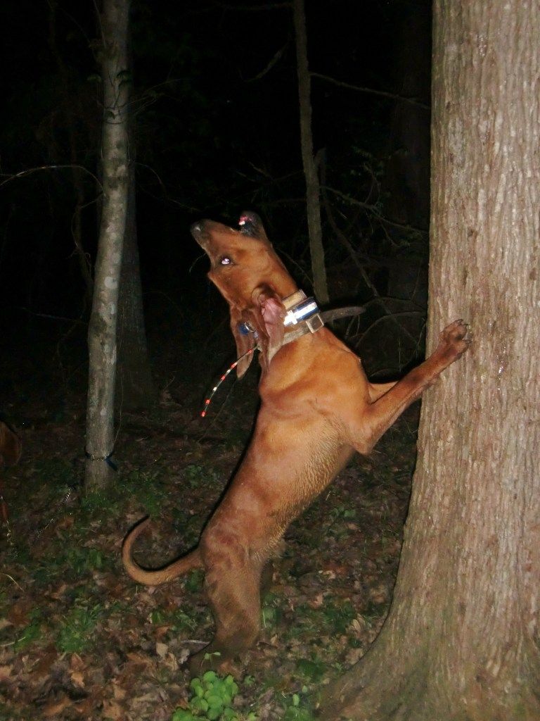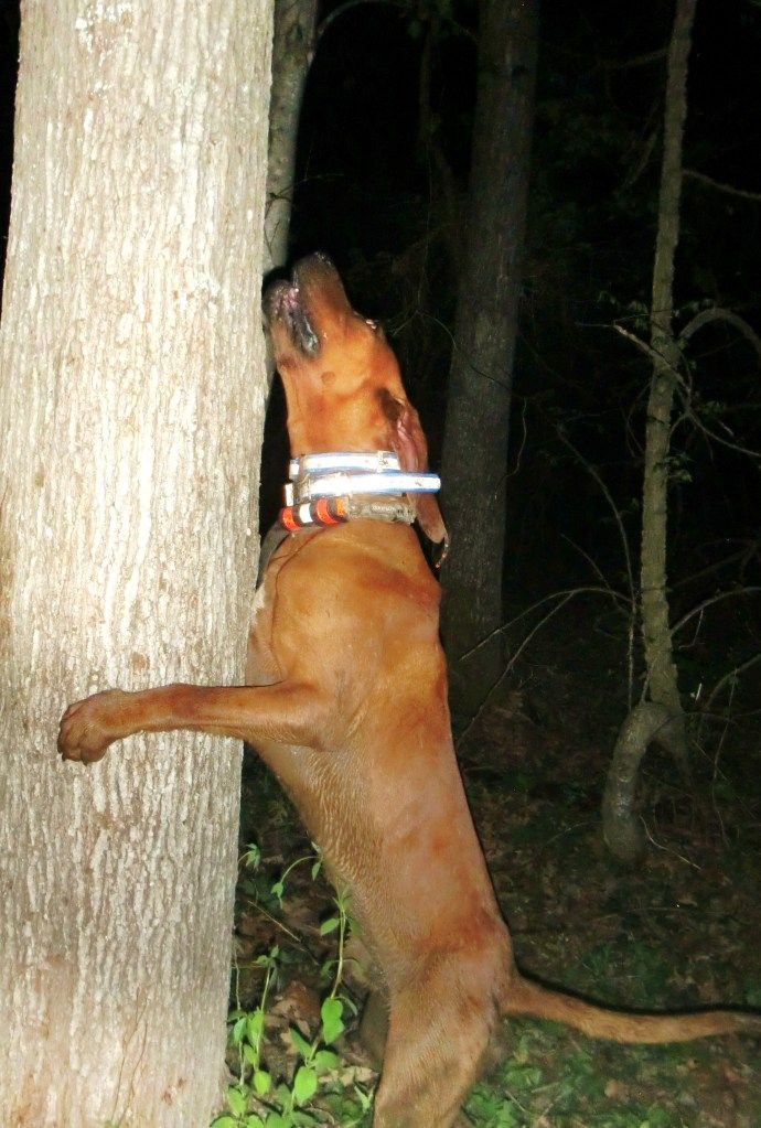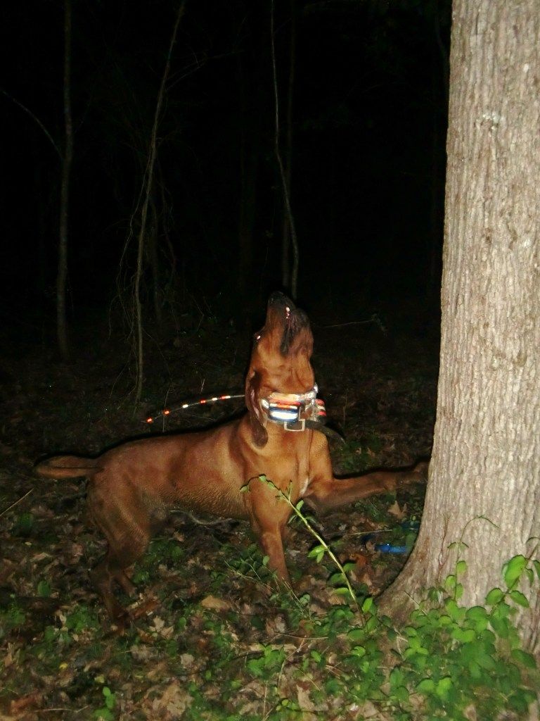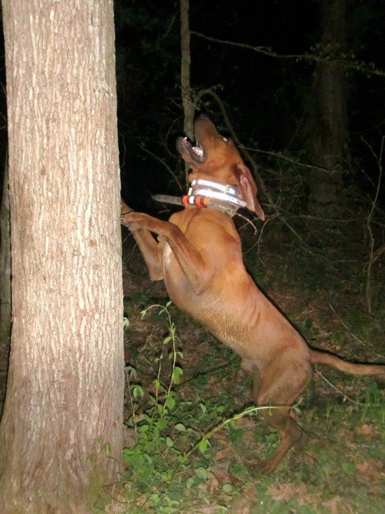this pup run loose his entire life, [ now 7 months old ], had never been hauled, had never been around strangers, had never been out at night, had never been put in strange country. i picked this pup up , forced him in a box for the first hunting trip of his life, drove another hour up the road, got him out with strange dogs all around him, collared him up, and cut him loose. strange place, first hunt, strange dogs, strange people. the older dogs struck in and run a coon red hot and treed about 100 yards below us and fell treed. smoking hot track. this pup ran into the dogs and was at the tree when i got there. i tied my reba female back and noticed this pup winding and working around on the ground. all of a sudden he climbs up on the tree smells around and latches it back. i was amazed, but the big test for sufficient go power will be next. got a pick of him.