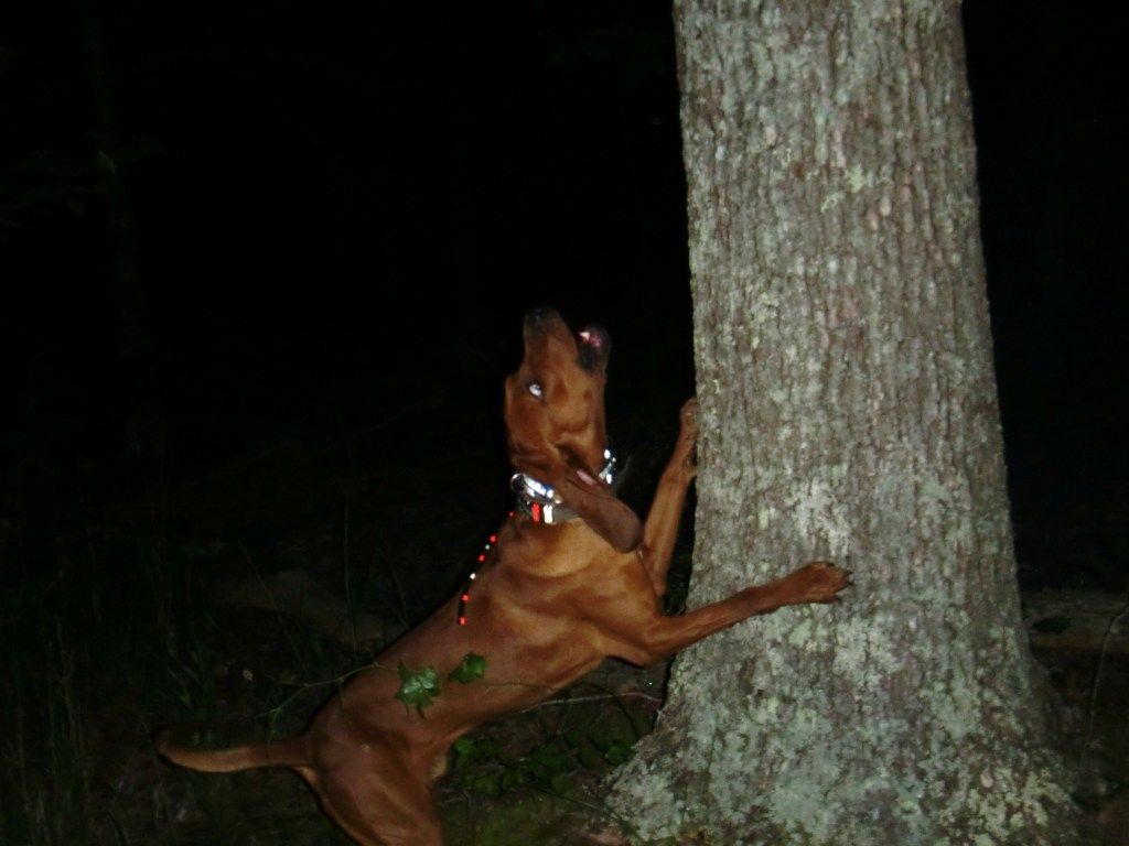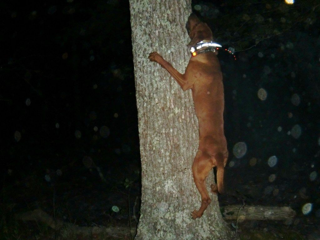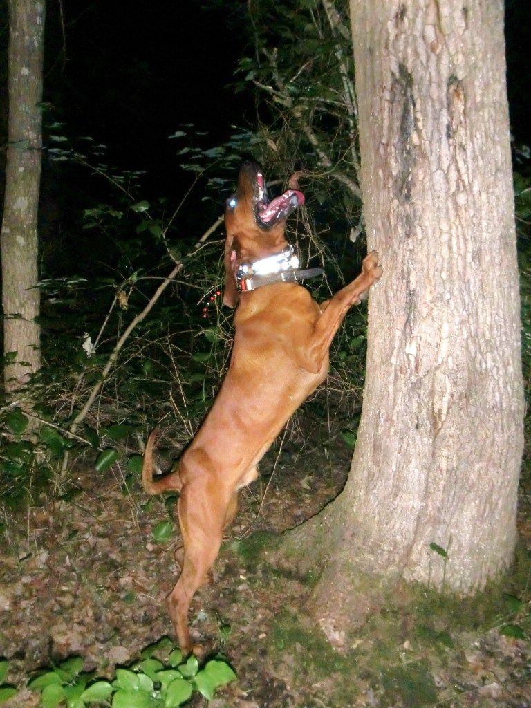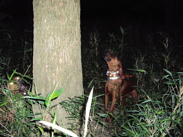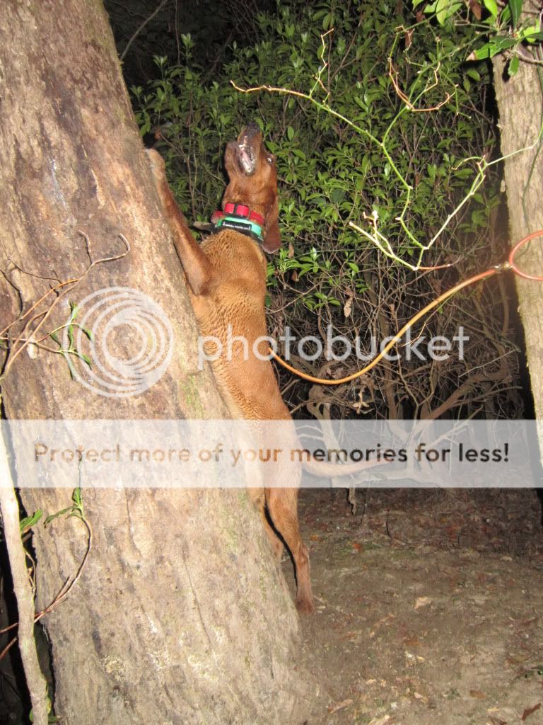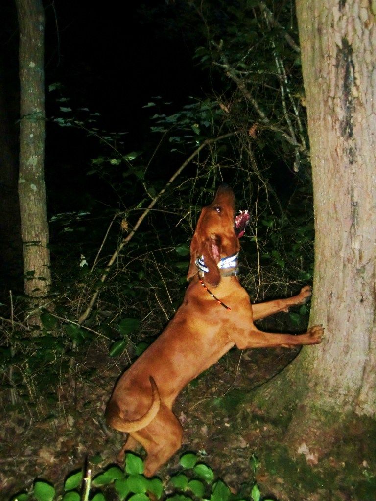 They blew off the leash side and side was runnin the creek about 100yds out when jo-ann yelped out for 1st strike, and Roxy put in right with her. The track ended quick with Roxy locatin and gettin 1st tree, with Jo-ann tryin to tree right behind her.