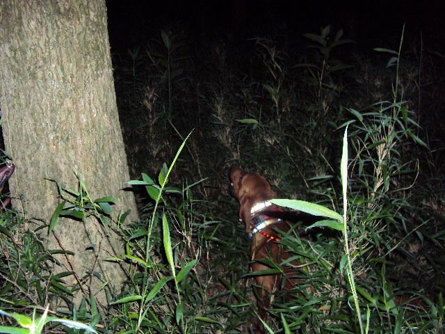 I started in slow waitin to see what jo-ann would do and she greeted me off the tree and I hissed her back to it, but she followed me back. She treed pretty good at first, but kept wantin to take the track on. She jus wasn't convinced that it was up there, but it was. I tied her to the tree and sit on a log for about 30min, or so and she got to treein better as time passed, but the excitement was when this great big ole coon climbed down a ways and jumped out. The weeds were tall and he got away from Roxy at first until I turned Jo-ann loose and she got on track. They ended up catchin him in the creek, and the fight was on. The coon ended up gettin in behind some tangled up roots on the bank and I was extremely happy he did, cause it could've been real bad. But she got her a taste of a great big coon full of life.