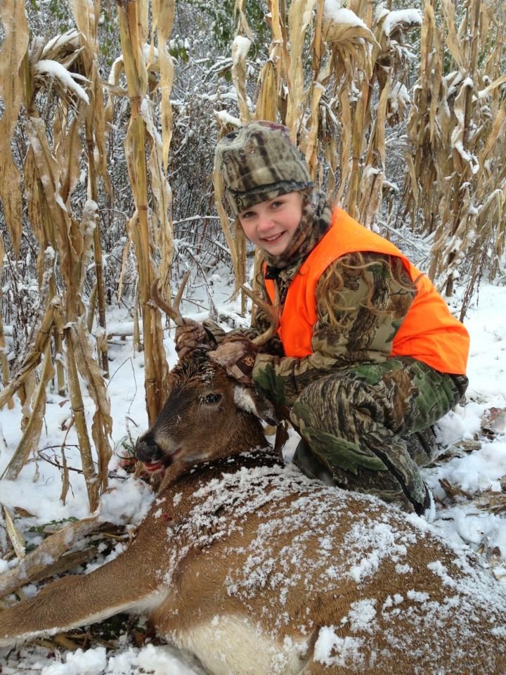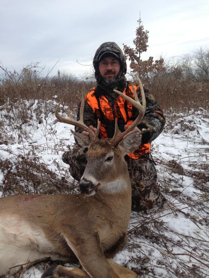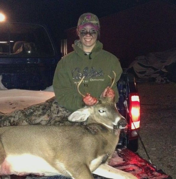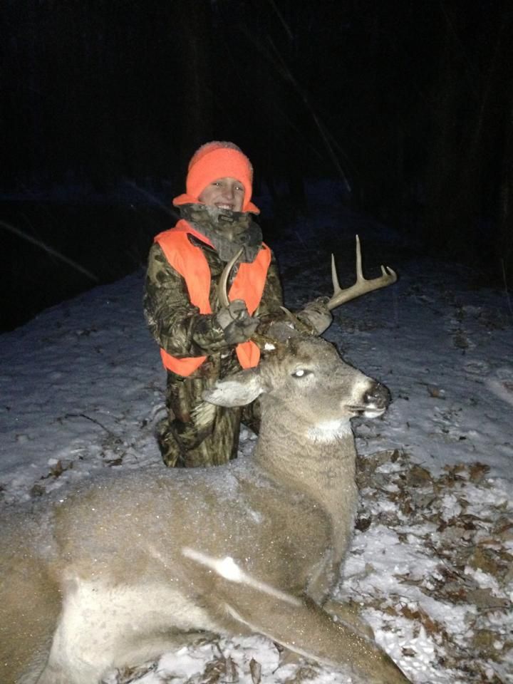 I have temporarily switched gears to deer hunting as this last weekend (23rd & 24th) was the Ohio youth deer gun season. To start it off my 10 yr old daughter was up to bat. Sat morning we got into our tree stands that we're hung 20' side by side overlooking my food plot (corn). The temps were in the 20's with 20mph + blowing winds. We made it from 6:45 till about 9:45 without seeing any deer movement. We got down and I decided to set up the ground blind along the corn field and turnip field. After lunch we got back in at 1:00, to spend the afternoon in a nasty snow storm. At about 4:00 the snow let up and the sky temporarily cleared. I told Hunter to be ready they were gonna move. As I finished my sentence I looked to the woods and there stood a buck, he walked right out to the field edge and checked the scrape. At 55 yds standing still Hunter put the smack down on him. As he ran into the corn field I hollered you got him. Hunter jumped up, yelled, I got him? And burst into tears of joy and was hugging me. After a 40 yd tracking job her deer was found. Hunter has already got a couple does in the last few yrs but really wanted a buck this yr. I am so proud of Hunter and her 8pt buck!!!