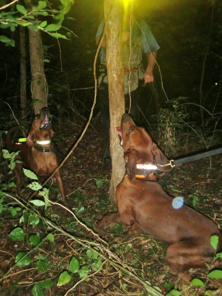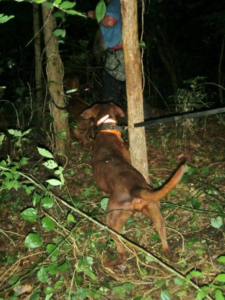 Poor ol Jim had a rough night last night. We cut loose along a corn field on top of a holler and they put one in the ground quick. Then the other 2 dogs went to horse racin and apperantly me and Kent broke Jim from that last week, because he stopped about 300yds in and came back. I tried to send him back out but he didn't want nothin to do with it. He hung around close for about 20min. Then decided it was time to roll yonder. He rolled in about 350yds by himself and struck along a creek, and the rest of the dogs pulled to him, he finally got locked up on a big tree top in some rough cut over.
