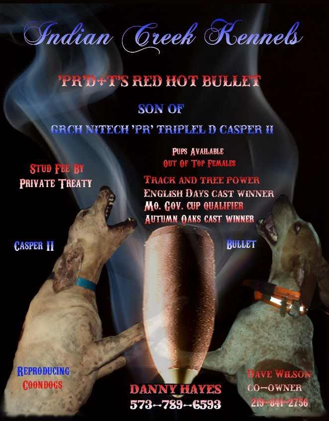 Casper will bust a hole in the dark. Honest fast cold nose strike dog, BIG booming bawl on track with plenty of mouth. Dont stand on his head with a track. 2 loud dieing locate then break in 2 a chop on tree about 100 bmp about 85 to 90% acurate.