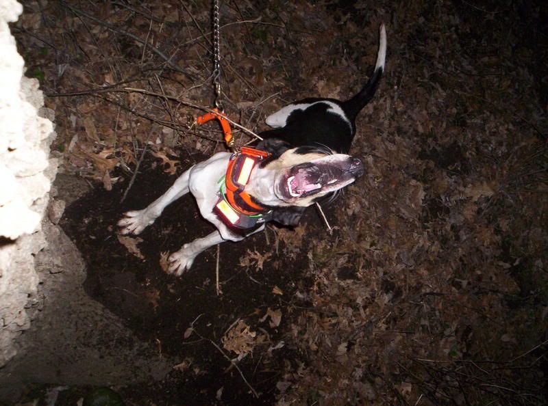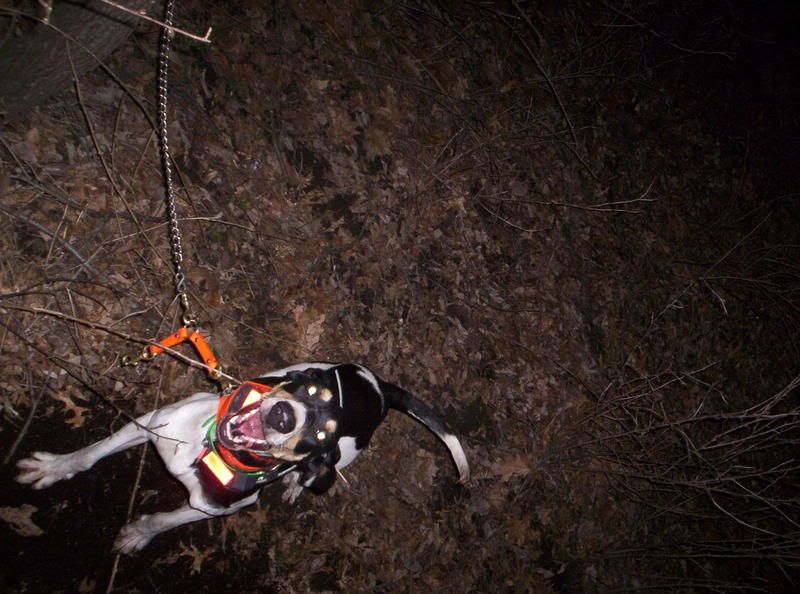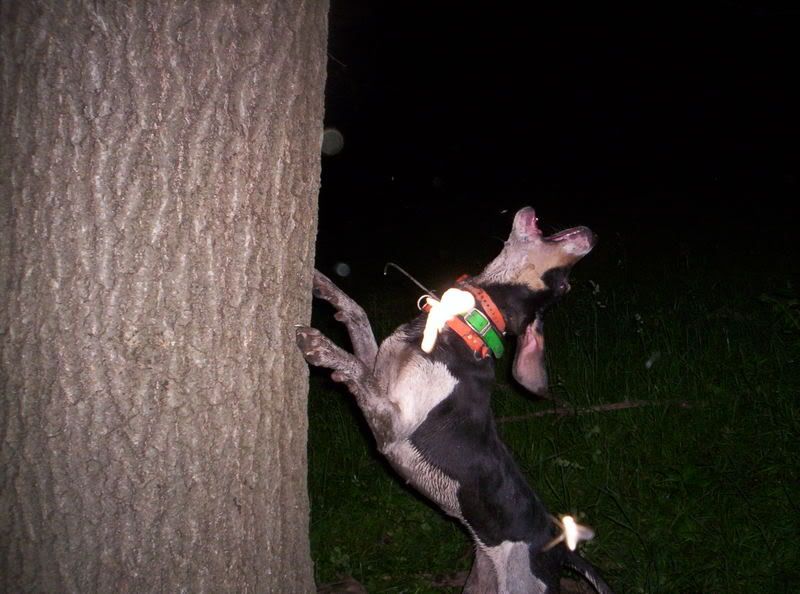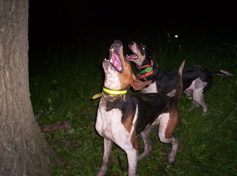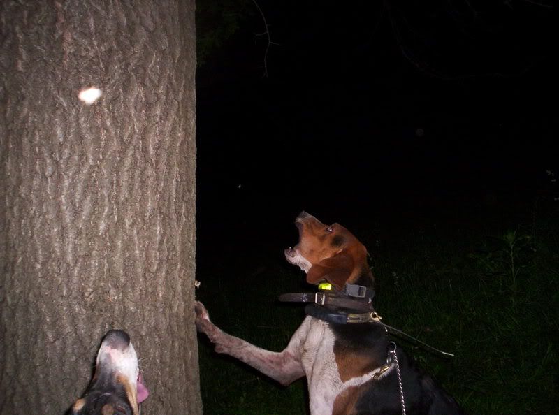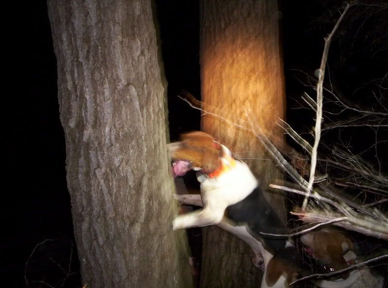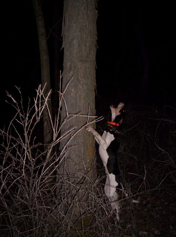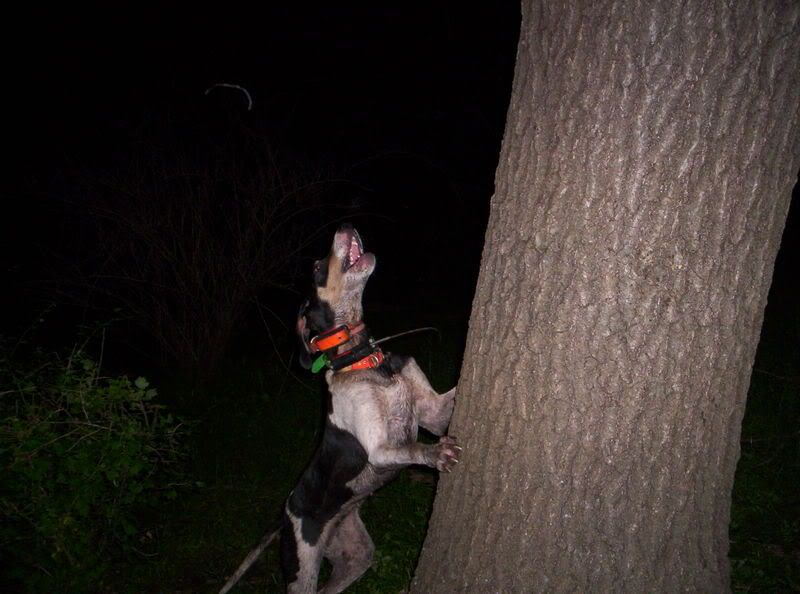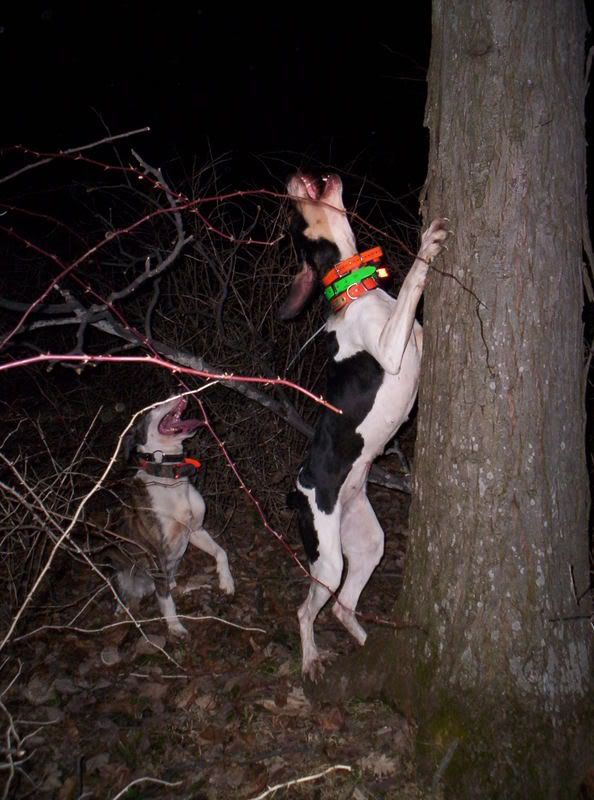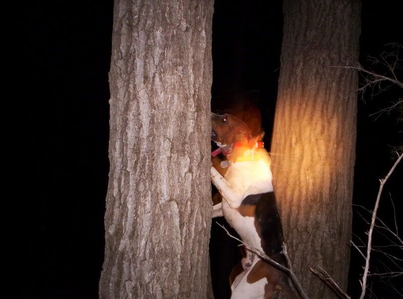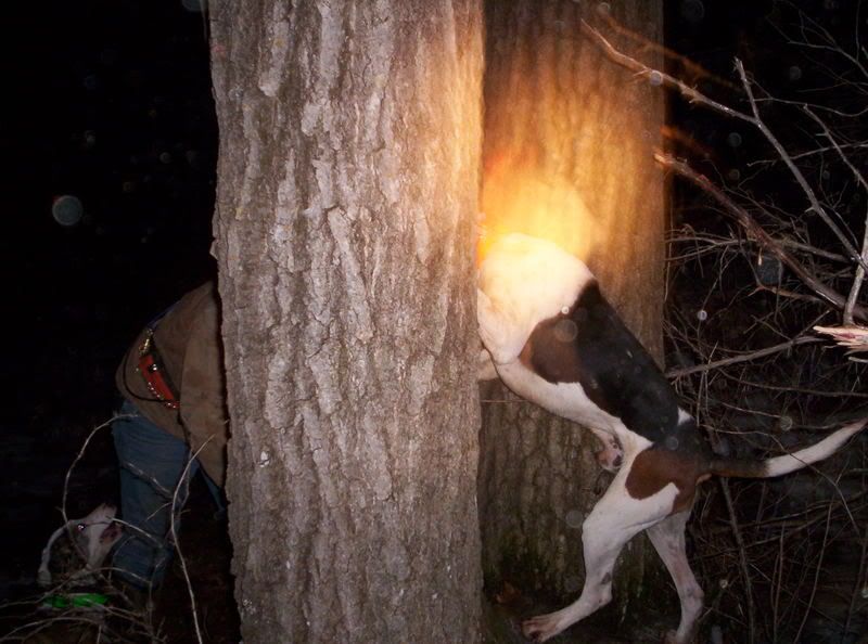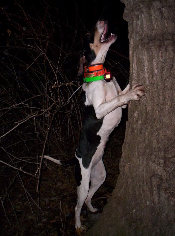 Sally is out of heat now so I took her and my cur Lilo for a run tonight. The first drop Sally struck a track 30 seconds off the tailgate. She worked wide open to the bottom of the hill then half ways up the otherside. She probably pushed the track 250-300 yards. Sally located twice and started to ROAR on the tree. About 5 seconds after Sally located Lilo fell in behind her treeing right along with her. They had the meat! I pet them up good and headed back to the truck.