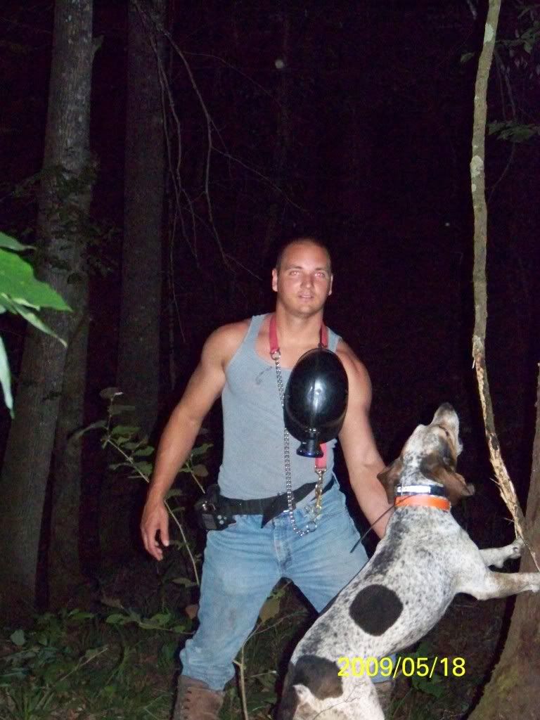Here is a sure nuff coon dog, will get treed with the meat any time i take him. meat might be in a den sometimes but it will be there somewheres. gettin to be bout 85 to 90 % accurate. Ive had him since he was 10 weeks old, Hes out off charlie adkins stock, goes back to goyonder bo, goyonder cougar and all those dogs on one side other side is a lot of hardtime speck stuff. Been treein me coons since he was 8 months old and hes 5 now. Doesnt miss a beat. Hell heres the lates pic of him with a coon up a tree earlier this evening.