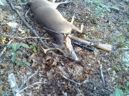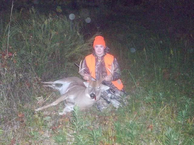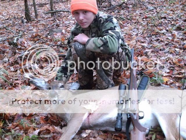 I gave Charlie Trecek, a friend of mine, a call when we got home to see if he had a spot we could go but no answer, so I left a message. Charlie called me back around 3:30 and said come on out and get Tom a deer. We were out there and on stand by 4:00 PM. At about 4:45 this doe came out of the woods about 225yards away in some brush. We watched her for about half an hour, while she slowly browsed her way to the edge of the hay field. Once she got out in the open she was around 100 yards away. Tommy was watching her through his scope and thought he could make the shot. I said "go ahead and drill her", reminding him to just squeeze the trigger and hold the crosshair on the deer after the shot. Tom let her have it and she buckled then ran about 20 yards and stopped in the hay field. I told tom to "hit her again" and he did. She winced again and went another 10 yards and stood there. "Hit her again" I said, and Tom shot again. This time she made it to a small brushy spot and went down. We could see her from where we were. I was watching her with my binoculars and she was not moving. We waited about 10 minutes and went down to get her. She was dead. Tom had hit her every time. The first shot was right through the heart and lungs. She was standing dead for the last two shots. Tom was as proud as could be. He even told me that, "this was more fun than playing World Of Warcraft on his computer!"