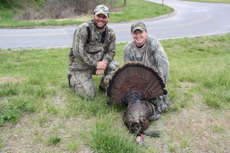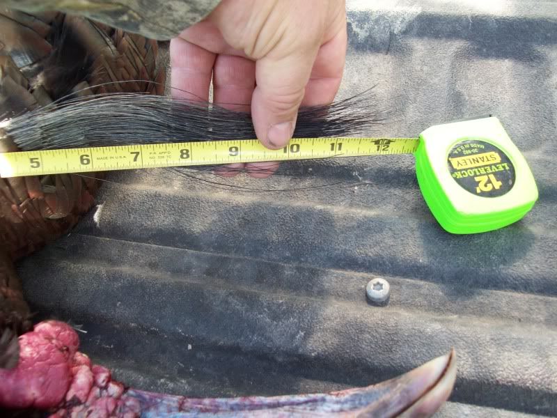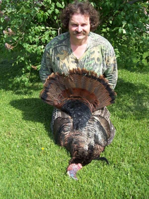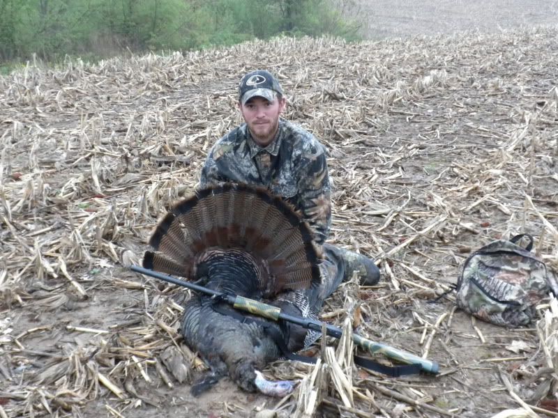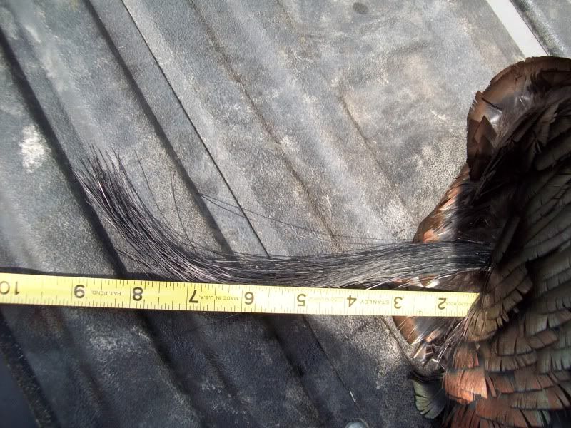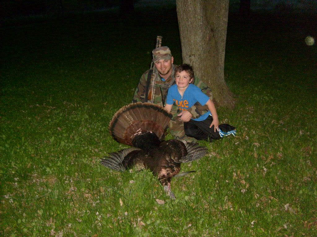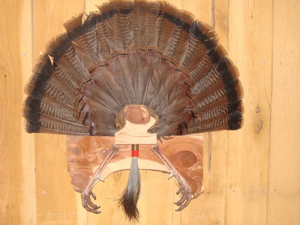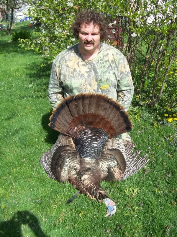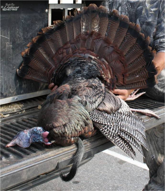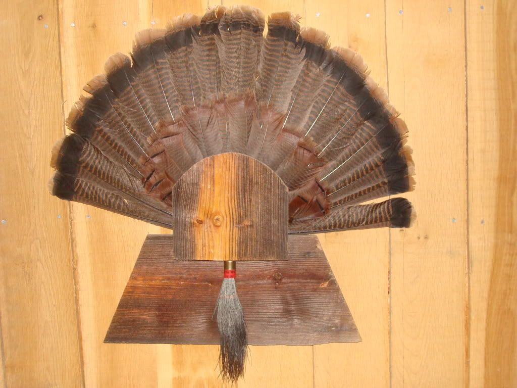 HERE IS QUINCY'S TURKEY HE GOT THIS YEAR. THE FAN WAS 29 7/8 INCHES FROM TIP TO TIP, IT WEIGHED 22LBS 9 0UNCES WITHOUT THE GUT. HAD 10 1/4 INCH BEARD, 1 1/8 & 1 INCH SPURS