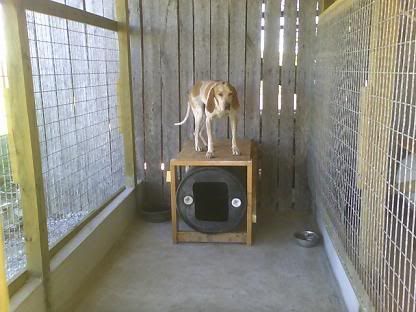 gunners barrell is under floor of puppy kennel for added shade,dont like the white barrells ,will crack in the winter if the heavy dogs jump on top of them .