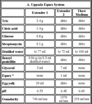 I ran some Test on 4 Different Freeze Extenders, The one I was using One Extender From Partners Animal Health But The DryIce Shipping Cost Doubled to $78 Just for Shipping of their Product !!!!! .. So Out of the 4, I had the Very Best Results with "Canine-EXT" Plus they Send enought Product to Collect on 7-10 Dogs depending on concentration of the Sample .. Above All other Products on the Market when Freezing in Straws and Pellets I have been getting around 92-94% Thaw Recovery with the EXT .. Which I belive is the Org. Canine Freeze Extender "Uppsala Equex Formula" .. Also If you have a Compounding Pharm near you they can make it ..