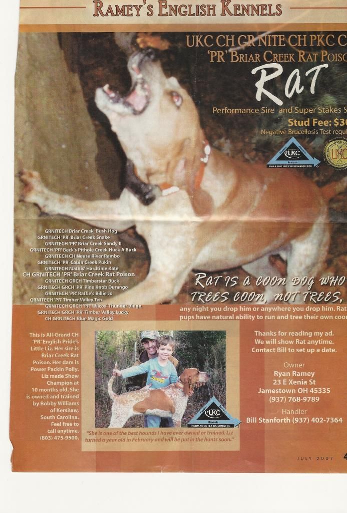 UKC GR NITE CH PKC CH PLUS POINT BLUE BOY BRUISER (66 "canes" stored at OnceFrozen) Direct son of DUAL GR CH PKC CH CLEAR CREEK CADILLAC JACK x CH GR NITE CH '95 UKC World Hunt High Scoring English Female WELLS' LITTLE PATCH
