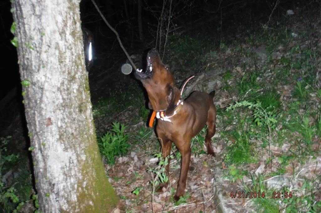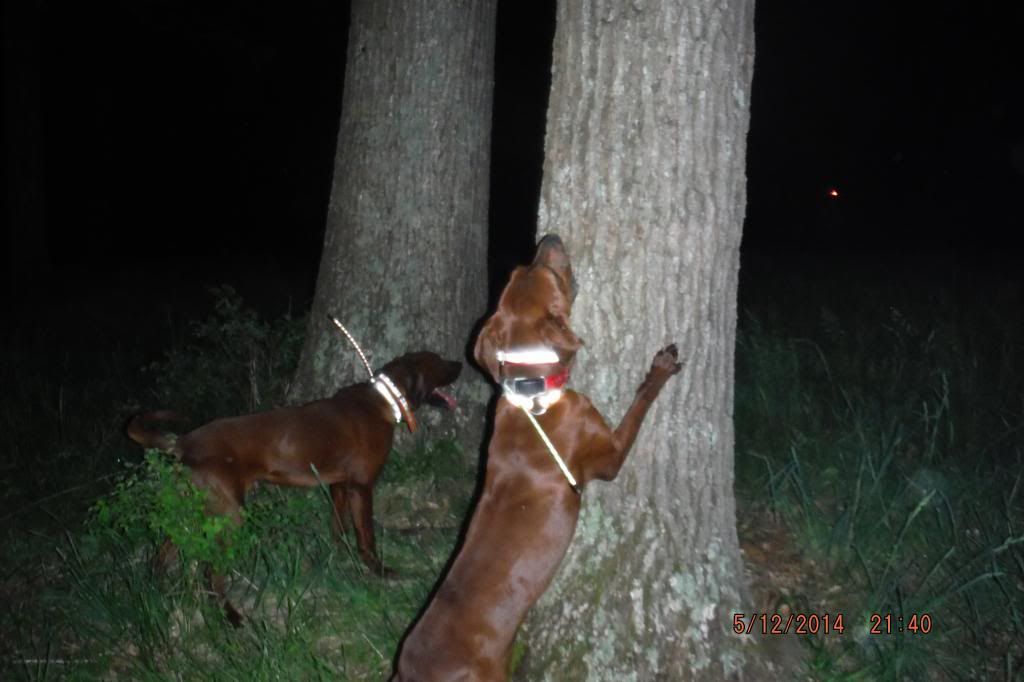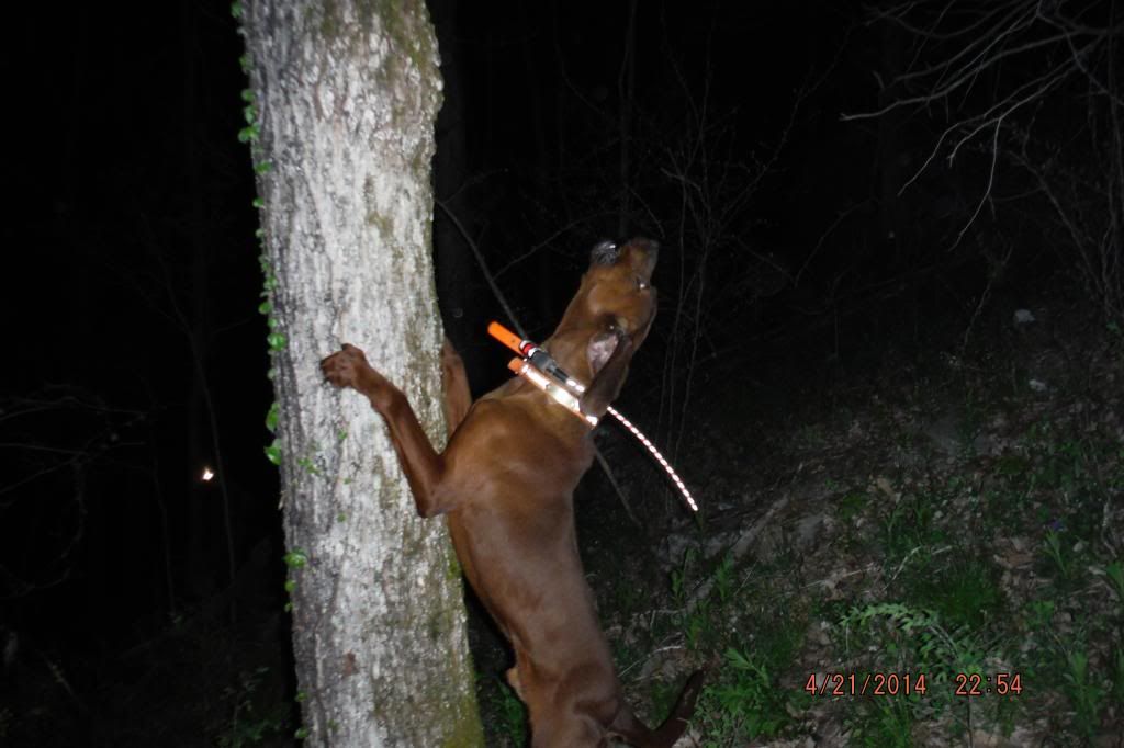We cut him loose last night with Rusty and they got gone quick. Rolled in about 700yds and started workin around on a cold track and Rusty came back then went 100yds left handed, but Tim stayed out and finally worked this cold track up the holler to finish it in a big oak tree with the ringtail sittin up high. It was a bad track and he finished it in style.