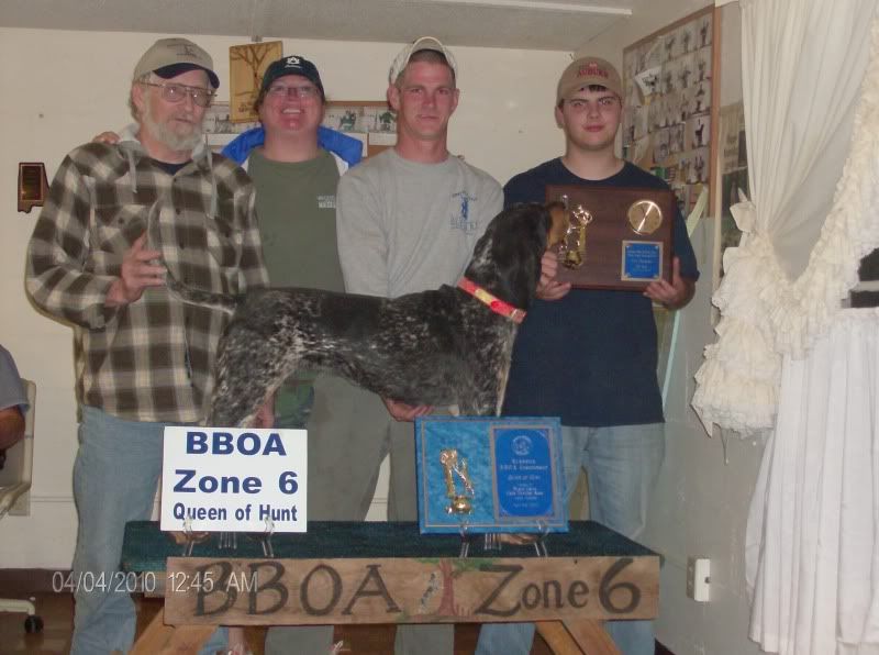(2010 BBOA Zone 6 championship Queen of Hunt and High scoring dog, 2010 Alabama State BBOA Championship Queen of Hunt and High scoring dog, 2010 South Carolina State BBOA Championship Queen of Hunt, Qualified 2011 WI governors cup)