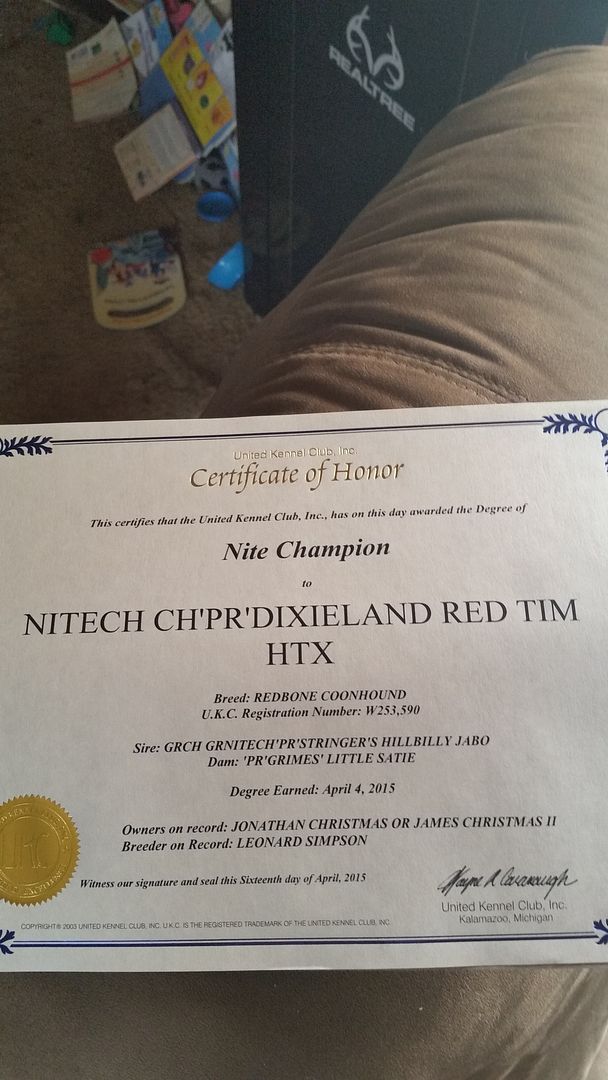 Well I ain't posted anything on here in awhile, but we have been huntin a little. I have been pushin Dixieland Red Tim pretty hard and we was able to finish him to HTX last weekend with 1 win from Springfield, Tn club, and 2 wins from Houston county club in Erin, Tn.
