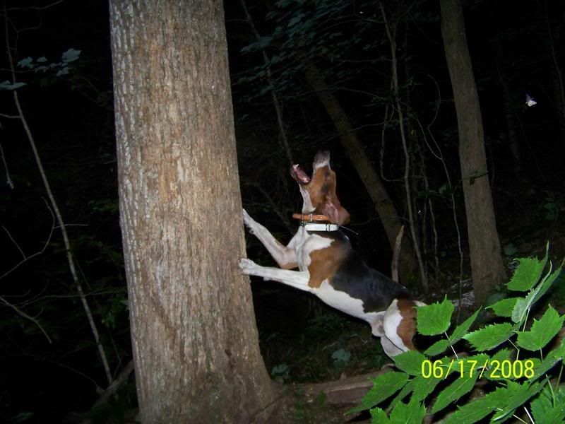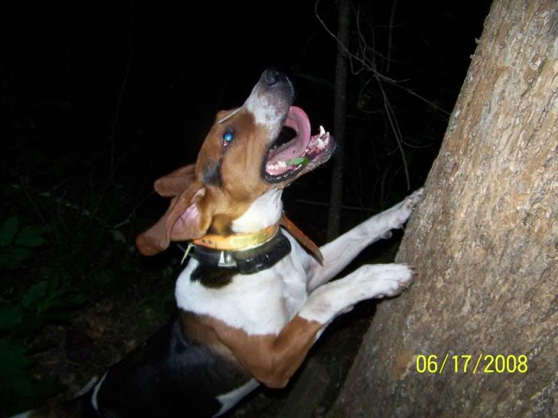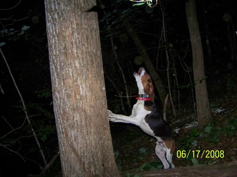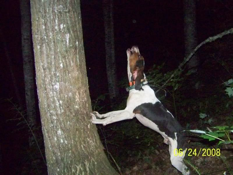 THE NEXT DROP, WAS JUST RANGER AND HERCULES, THEY ARE LITTERMATE BROTHERS, AND TURNED 1 YEAR OLD ON 6/1/08. THEY TREED ONE, AND QUINCY SHOT SOME VIDEO AND WAS STARTING TO TAKE A COUPLE PICS AND GOT 2 NICE ONES OF RANGER AND HIS BATTERIES WENT DEAD. THE VIDEO WILL BE GOOD TO SHOW THAT BOTH RANGER AND HERCULES WAS THERE THOUGH.