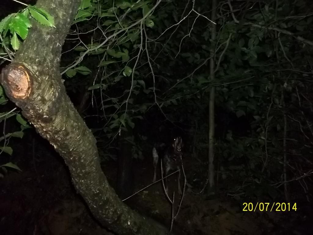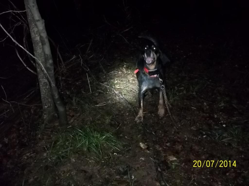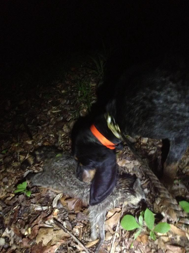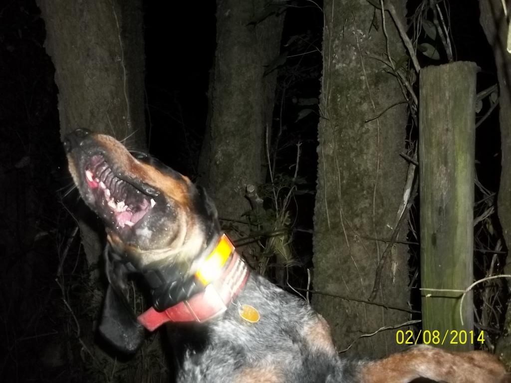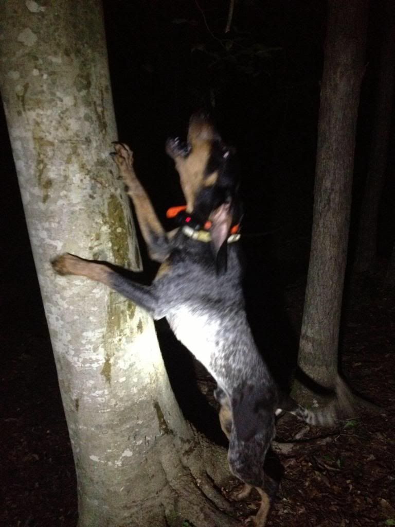 Went last night alone, took Blitz and took advantage of this cooler weather before its gone. 1st drop I sent him down a creek bottom and he went right handed from the creek according to the garmin about 387 yards an just felled treed. Man the saw briars would cut you into, just about had to crawl into himit was Thick an hard to shine. He was treed on a pine with muscadine vines hanging out of it but I did not see the coon just could not find a good spot to shine the tree THICK, THICK. Pulled him off an walk about 100 yards back down the creek an cut him. For along time I did not hear him , so I look at the garmin to see what he was doing and he was 726 yards going south down the creek. Blitz finalley open and I could tell that the track was bad . He drifted the old track here an there and was going across a pasture into another bottom but was not saying alot on the track. Blitz was 0.1 mile from me when I last heard him so I decided to get closer and he was still opening here an there. I moved in on him at 715 yards an he just went silent for a minute or to. Then I heard Blitz load up and he was GLUED! Made my way into him an the woods were cleaner, he was treed down an old fence row . Shined an squalled an 2 sets of eyes look back , it was 2:00 am so I called it a night.