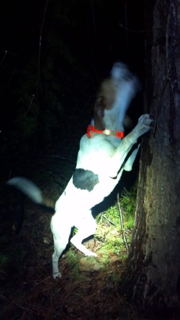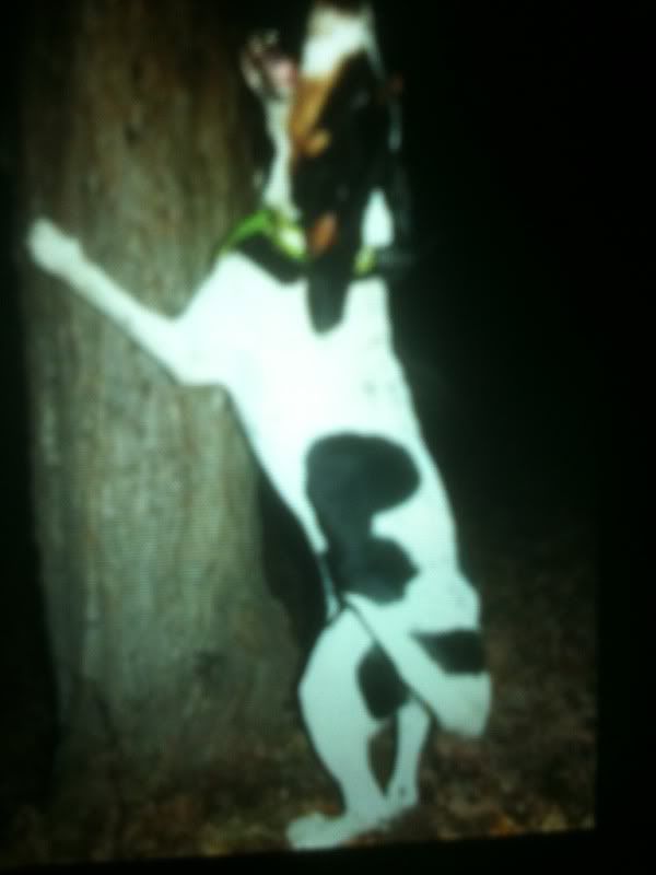 We have been hunting hard this past week or so. Swag has been holding his own. Went with 4 NICE hounds Friday night. He split twice from 75 yards to 400 yards with the coon both times while the other dogs had a possum, a pine and two slicks. Not shabby for a 16 month old pup. It's nice to hunt a dog that you can load the gun when he trees! This is from the first split Friday night. We couldn't hear the other dogs for him treeing! He's up to about 75 lbs and he has the amp to back it up.