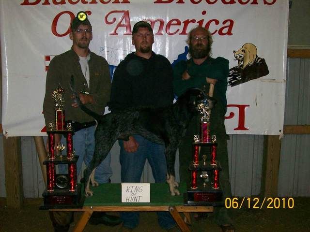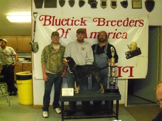 My son Dan's young all blue male outa "Patch" & "Kandi", "Duke", was standin on his hind legs doin the thermal shuffle last night in front of myself & a couple of our families coonhuntin women,Kali & Stacy. Matt,Dan & Benj had turned loose off'n a tree close by & "Patch","Sas" & "Moe" gathered some ground & was scourin the hills so they headed in their direction. After that is when "Duke" commenced to dancin in a cornfeild & honed in on this lil bushy tree & started givin'er.