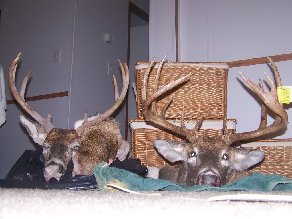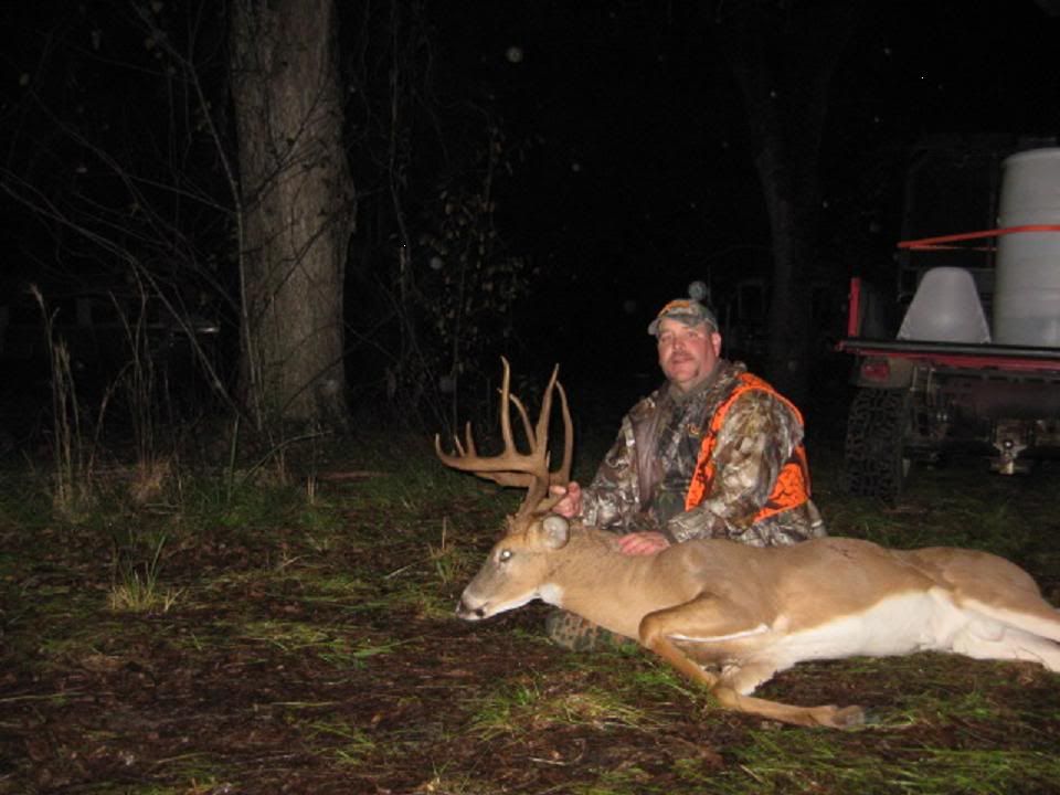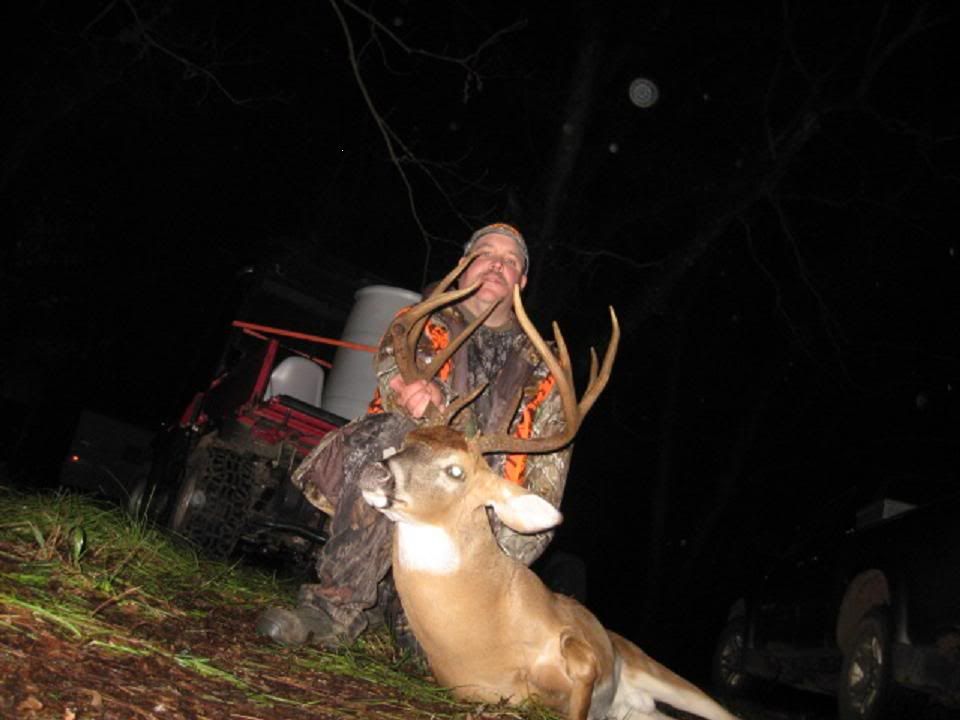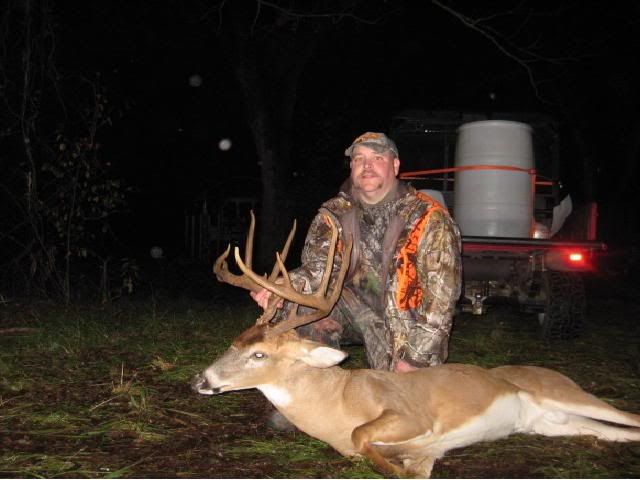 Shot this monster out of my tree stand, opening day,In Laclede County, MO... I was getting kinda bored of not seeing or hearing anything so I lit up a cigarette, looked to my left and there he stood 20 yards away downwind sniffing a special golden estrus wick! shot 4 times before I finally cleared the shooting path of twigs, lol, but he just stood there, and looked around trying to find out what was going on... Anyway thanks for letting me tell my story once again..... The one on the left is my bow kill for this year, Same tree stand.....My wife shot her first buck out of that tree stand, and my father shot a main frame 10 pointer.....My wife calls it "The Honey Hole" ...LOL