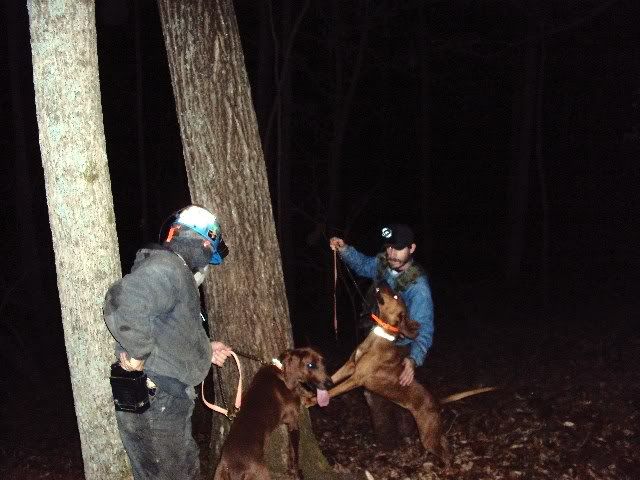 Then we come to last night....holy cow did this one go well at the beginning. Jonathan Christmas came down this way and was toting JoAnn (a litter mate to his Jim pup). We walked the dogs out there away from the trucks there and cut them loose. All of the dogs (JoAnn, Dixie, Jack, Duke) and they left with the dirt kicking up. Dixie went out about 150yards and then turned back towards us but kept on figuring the smells out and doing what a puppy does. She did good for her second night in the timber.
