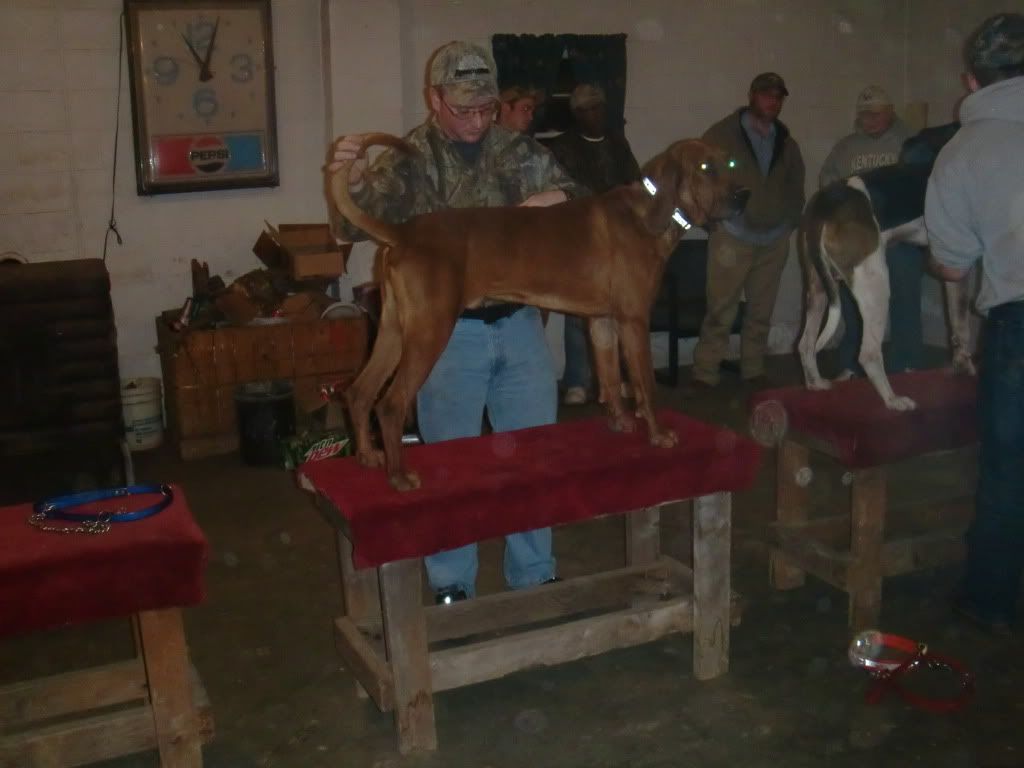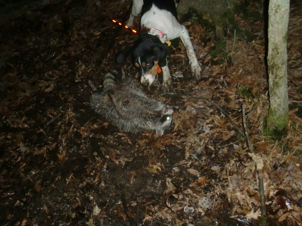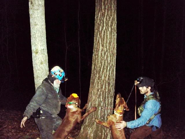 JoAnn, Jack, and Duke were flat GONE. JoAnn and Jack were together and Duke split off and did his own thing. They struck in and Duke ended up treed on a den tree. Jack had a mind to line it out good before he would tree. He came in by us at the tree wide open (both mouth and speed). He passed the tree and came right back to the tree and did a bang up job treeing.