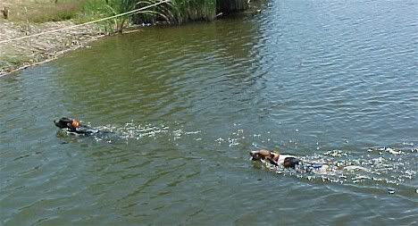Of all the places we have been to water race, Cole Camp has to be one of the best, in my opinion...It's a large/wide pond, not a pit..I like the larger, wide, ponds better, again, my opinion...The pond is real wide and most dogs will just as soon swim the distance to the finish as to swim out to run the bank...The start box has more than enough holes, due to the heats being smaller now than what they where when the box was built. There is a boundary fence on either side of entering the water to help keep bank runners in line..There is also a fenced in area that starts at the finish line and encloses the treeing pole. Also, at the finish line, the dogs are exiting on a fairly level bottom, I am thinking it's like an old boat ramp, maybe..