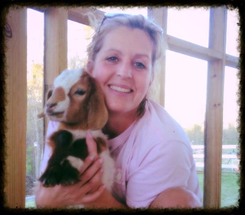 Hey ... My new little friend ... Billy !!! Hee hee .. We were out at dads yesterday .. It was 87 .. Great weather .. Rode horses and played with the billy goat , cows and Molly .. She did not know what to think if billy !!!!!!! Nor the chickens !!!!!!! She got some switchens ... Hahahahahaha... Terrible pic of me .. But I wanted every one to see ole billy !!! Hee hee