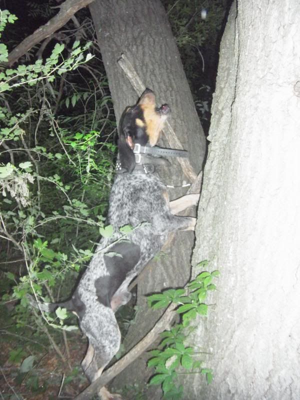 Last night on the last coon, he actually went off by himself and pushed a track through some multi floral rose that wasn't fun for me to walk thru with brush chaps on, so I can only imagine what it's like for a dog. He pulled the trigger on the tree, and within a few moments my older female was there to give him a pat on the back.
