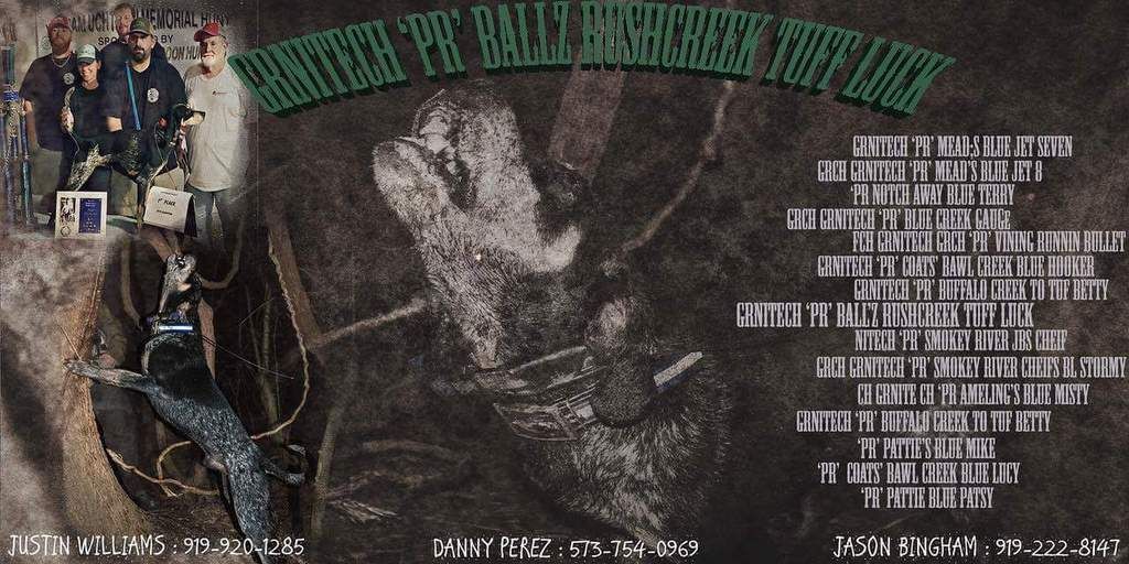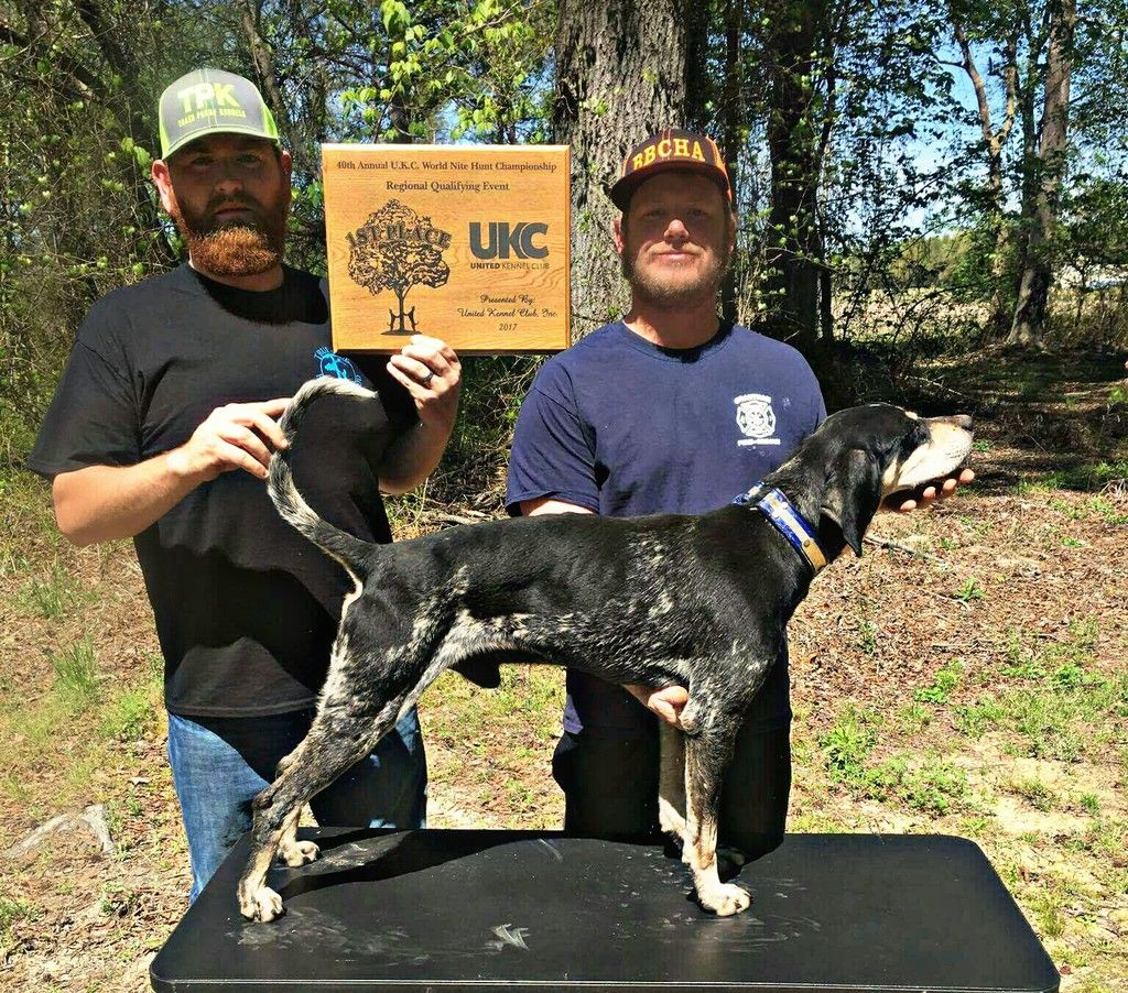 We never started hunting until 3:00 am with the absolute hardest frost you can imagine. 6 drops in a row, he sank in there starting cold tracks, skipping, drifting and consistently treeing coon. I'd give good money for a 2 year old Tuff! His superior nose and tracking ability is what has made him shine this past year going from nothing to grand in ukc and nothing to over halfway to pkc champion all in about 13 months roughly, as an 8 year old, in 3 different states! Time has proven that conditions really can't get too tough for Tuff. He will compliment ANY breeding program, I do not have a shadow of a doubt about that. Buffalo Creek Kennels, Trash Proof Kennels and Jukes Treein' Blues WILL be moving forward with the blood that runs through this hounds veins. We would love nothing more than to share this with all of the bluetick breed as we're all in this together, to reach the top we have to work together! Tuff deserves any and all females brought his way. Give us a call or shoot us a message and we will work something out, we're not in this to make money. We are in this and promoting hounds like Tuff because we love coon hunting and blueticks.