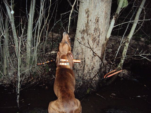 Now to the cast. I cast out with three very nice younger dogs, it was a 2 1/2yrs old English, 18month old Walker, and a 17 month old Walker. We cut them loose and they took off hard. Jack got struck in 4th and then nothin....all of the other dogs were going left handed at quite a pace when all of the sudden Jack fell treed to the right. We got in there too him and he had the meat. That put me at 150+.
