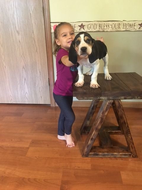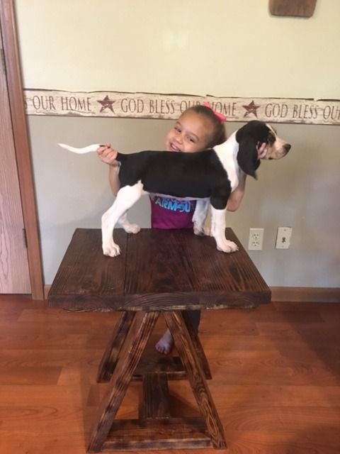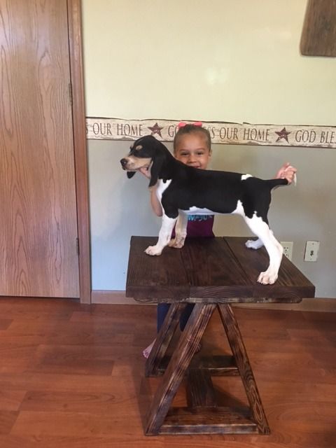 These are BIG & STOUT houndy pups! They'll be 8 weeks old this week and have been runnin loose ever since their first shots at 5weeks old, they are in the creek and woods every day and are aggravated and handled by this baby girl that had to help take their pics, there isn't a shy bone in their body. They got a head start and good mouths to go with them. Brains and very good actions for 8 week old baby pups.